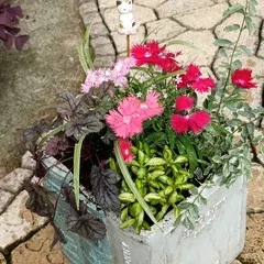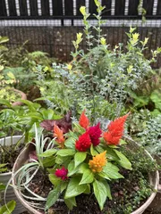 カラフルなケイトウにヒューケラ、タイム、あと後ろの背の高いグリーン(名前は❓です)、それと左手前はハクリュウかな❓(曖昧でごめんなさい)を使って寄せ植えしたよ❤️