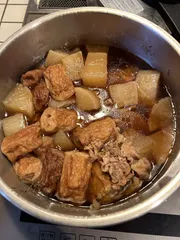 おでん ■材料大根一本、練り物2袋 残り物の豚肉■作り方す全て圧力鍋に入れて、水は具の半分ほどさ酒、味醂、砂糖、紫醤油、だしの素、ブイヨン一個、すき焼きのたれす全て目分量なので、お好みに合わせて調節してみてくださちね。■工夫ポイント すき焼きのタレを入れることと、ブイヨン一個を入れることかな。 亜月のクッキ