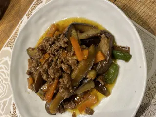 麻婆茄子 ■材料 茄子🍆4本 人参🥕1本(小さいの) ピーマン🫑2コ 合い挽きミンチ200g ■作り方 オリーブ🫒油大3を入れ、全て短冊切りにした、野菜を投入して中火で炒める。ひ火が通ったら、取り出して別の容器でスタンバイ。 次にミンチ肉に塩、胡椒して炒め、火が通ったら、野菜類を戻して合わせ炒