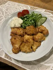 鶏胸肉チキン南蛮 ■材料 鶏胸肉2枚、春キャベツ、きゅうり プチトマト ■作り方 鶏胸肉は、1〜2センチの削ぎ切りにして、作り置きしている、甘だれに焼肉のタレを少しだけ加えたものをいれて、混ぜ込むフライパンに1センチくらいの深さで油を入れて170度くらちの温度でやく1分、胸肉の厚みが太ければ3分位が良いでし