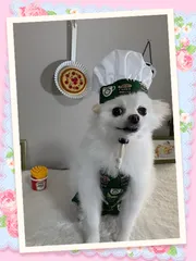 ベーカリーカフェ風ユニフォーム(ワンコ用) 毛で隠れて分かりにくいのですがコック帽とエプロンを手縫いでチクチク作ってみました♪