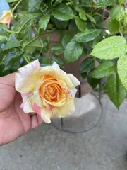 アップルローゼスさんの『四季の香』が咲きました。黄色とピンクのマーブル模様ですごくかわいいです。 枝が細く柔らかくです。花が重いので下を向いてさきます。