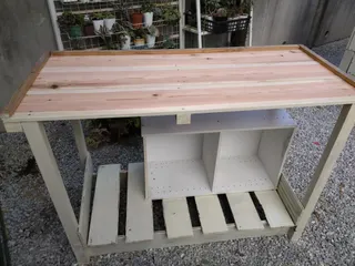 作業台 木材を頂いたので作業台を作ってみました。下にカラーBOXを入れて用具入れにしました。 いっぱい寄せ植えを作りたいな!
