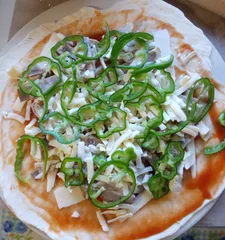 ノーマルなピザ ディープディッシュピザを作ったときの残りの生地で、普通のピザも作ってみました!ピザソースがなくて・ケチャップ・ベーコン・チーズ・ピーマン・玉ねぎ 👍イケます!