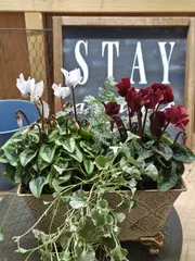 シクラメンの寄せ植え 少し黒みがかった赤のシクラメンと真っ白のシクラメンで😍去年のGWSのポインセチアの寄せ植えで使ったブリキ鉢がいい感じにしてくれてる〜😆🎵
