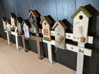 ガーデンピック9個のおうち🏠 1つ目に作ったのがコレ青いお屋根に白い壁モルタル小屋を意識して作りました🎶2つ目はコレ大好きなオリーブグリーンの屋根レオたん😺走り回っています🐾🐾3つ目はコレハロウィン🎃バージョンで暗ーいおうちにしました🎶全部ズラーっと並べてみました😊これからいろんな所に置いて楽しみます❣️ mahalo