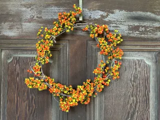 道の駅でツルウメモドキの枝が売ってたので買ってきて、リースを作りました♪残りは面倒だから、そのまま壁に飾ります😆 この色合いが秋らしいですね。