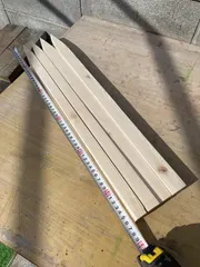 杭作り 家庭菜園や花壇で使う杭作り、570㍉程の杭を4本作りました。素材の角材は、地元の建材屋さんの木材無料提供でいただいてたものです。以下、作業中のショットです。↓バンドソーで縦挽きしてますが、少しドリフト起こしたりしてしまいます。この手の工具には付き物ですが。ドリフトしてしまった部分をカットしてます。先