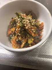 大根葉とキムチ炒め 野菜が高いですね😵大根の葉いつも捨てませんが今回はキムチと炒めてみました。キムチは前回作って一握り残っていた古キムチを使いました。大分酸っぱくなっていました。後からハサミでキムチカットしました。ご飯のお供🍚