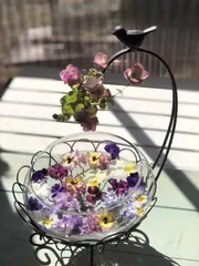 クリスマスローズやビオラ、カットしてからもまだまだ楽しめますね😊 ゆらゆらお花を眺めながらティータイム、贅沢な時間ですね💕