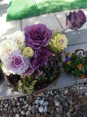 葉ボタン消費part3 もう大きな葉ボタンしか残っていないので、バランスとりにくい… 植えたばかりだから真ん中の葉ボタンが萎れているので2~3日後に水を吸い上げて落ち着いた頃にもう一度チェック、 2カ所空いているのは水仙の球根(去年の寄せ植え)去年の寄せ植え、水仙テタテータが放置されて3㎝くらい芽が出て