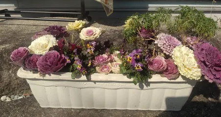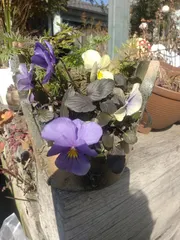 葉ボタン22ポットビオラ4ポットマーガレット(去年の寄せ植えから)グラス1ポット(株分けしたもの)65㎝プランターに盛りました。上から写真拡大して見ないで😆ビオラがモリモリになったら隙間が埋まりますので…それまでは😊