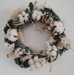 お庭のユーカリ🌿や、WSの時のドライフラワーで🎶💕 コットンがふわふわで🤍🤍、可愛らしくて、素敵なリースですね✨🎶