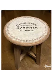 ミニカウンターチェア(二作目) 3月に二作品作ってましたが二作目がアイデア浮かばずやっとステンシルで仕上げました。(本当はトールペインとする予定でした😅)。機械のお店のロゴの様ですが字体の雰囲気が良かったので真ん中にステンシル。ぐるりと周りを囲ったのはウッドバーニング用のコテでハート型を気長に😂押しました。やっとこの椅子を二脚出し