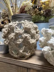 マクラメポコポコビンホルダー 麻ひもで2個目作ってみました👍💕ビン🫙のフタはアイアンペイントでブラウンゴールドに