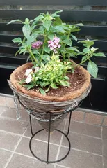 自宅から近いコーナンの寄せ植えバイキング参加しました。鉢にビックリ、チェーンでぶら下げるハンキングプランターを選びました。550円でした。台は別に購入しました。