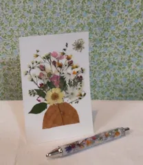 押し花のワークショップ🌼 千葉フラワーフェスティバルで行われた押し花のWS 参加して来ました☺️ ボールペンとハガキです💕 ボールペンは押し花を台紙にパラパラとちりばめ 更にラメも少々中々 可愛く出来ました(押し花は用意されたもの) ハガキは 半円状の葉を花瓶に見立て 押し花をレイア