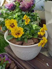 葉牡丹の寄せ植え 今年度購入した花でとても気に入った💜葉牡丹の『アイスダンス』また購入しようと行ったら、なんと在庫1ポット😭残り1つとこの『アイスダンス』に合う花を購入し寄せ植えしました😊💕『アイスダンス』は真ん中の後ろ、その回りで葉脈があるのが『クラシカルボンボン』その前にあるピンクが『プリンセスピンク』右側のギザ