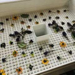 食品乾燥機でドライフラワーを作る! 食品乾燥機の設定温度を70度にして、ドライフラワーを作ろうとしました。1時間後に様子を見に来たのですが……。 「小さくなっとる……」(ll゚Д゚)ハァ? ビオラなんか小さすぎ。先日、ホムセンで購入したばかりだったんですが……。というわけで即中止しました。 うーん、シリカ