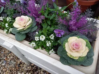 葉牡丹とビオラとアリッサムの寄せ植え 年々、花の種類が増えましたね😊💕今年度は、気に入った葉牡丹が多くいろいろな種類を購入しました。後ろのギザギザ葉牡丹は『紅くじゃく』おしゃれな名前😆❤️葉牡丹とビオラの寄せ植えしたら、ちょっとさみしかったのでアリッサムも入れました😄🎶✌️