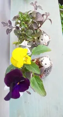 ハリネズミの寄せ植え 昨日やって来たハリネズミの鉢に寄せ植えしました。😍ビオラの挿し芽を使って寄せて見ました。😆横からはこんな感じです。春になったら多肉の寄せ植えをしようと思いますがしばらくはビオラで楽しみたいと思います。☺️