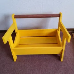 ソファー型鉢カバー 先々週のWSでソファ型鉢カバーを作りました。塗料は、持込みでアンティークカラーズのマリーゴールドイエローです。丸棒は、無塗装で持ち帰って、撥水のブラウンを塗りました。ビオラの寄せ植えを入れてみました。