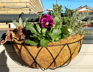 ハンギング 少し失敗? 10日ほど前に 初めてハンギングの寄せ植えをしてみました☺️ビオラが立ち上がってくるのを考えずに手前にしてしまったので 白の葉牡丹が隠れてしまいました😅上から見た所今考えるとビオラは真ん中で葉牡丹は手前でないといけませんね💦やや左から解体してやり直したいけれど あまりいじらない方がよいか 迷っていま