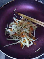 きんぴら 明日のお雑煮の汁を作って出た、大根の皮、人参の皮。今夜の天ぷらから「れんこん」を少しを合わせて、作りました。明日のおせちの一品です✨