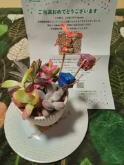 多肉植物の寄せ植えの当選したプレゼントを短い間ですがプレゼントピックと🔔ピックすぐ作り飾り付けをして飾りました‼️