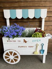 なんちゃってフラワーワゴン 全てカインズ材料で作成しました。車輪の部分は最後まで悩み樽のフタを利用してみました。中にはクラフトポットが3鉢入ります。もちろん花苗もカインズです。
