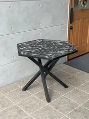 【カフェのDIY】これで最後のテーブルです✨ ■作品内容このテーブルは屋外のウッドテラスで使う用に作りました❗️針葉樹合板(カラマツ複合)をカインズさんで見てこの材に決めたんですが、910×1820だったので、まぁ半分にカットして2枚を木工ボンドで重ねましたぁ💨💨■こだわりポイント2枚重ねとものを急遽💨 思いついて六角形にしてみましたぁ6️⃣💕