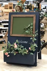 黒板付きフラワースタンド 初めて♪♪♪wsに参加したと思います。♪♪♪wsを積み重ねて、上級者コースに参加したいと思います^ ^☆ ベースカラーはバニラで作ろうとずっと思っていましたが、今朝家族会議で、アイアンブルーに決定して、念願のフラワースタンドが完成しました!! とっても楽しいWSでした。ア