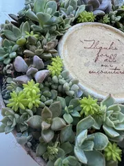 先月に作ったリースです❣️ 100均の粉ふるいの真ん中にサバ缶を置いてリースに😊葉挿しのチビ苗でチマチマ寄せ植え🩷めっちゃ可愛いです〜