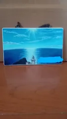表札🟦 思い出の風景を表札にしました🌤️100均の木の壁掛けにアクリル絵の具で描きました🎨右下は名前が入っているので消しています😊北海道の地球岬🌎天気もよく水平線がきれいに見えていい景色でした☺️