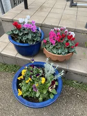 親戚に貰った青い鉢にガーデンシクラメンの寄せ植えと、パンジーとビオラの寄せ植えをしてみました😊以前に投稿した茶色の鉢のガーデンシクラメンと一緒にパチリ💛少し庭が賑やかになりました(o^^o)
