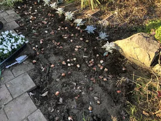 お庭を綺麗にする計画、そういえば先週水曜日にチューリップ球根を急いで埋める!と宣言してたわね。 夏の花がそのまんま、初霜が降りてようやく枯れてきましたね。まずは草取り、そして多少の耕し。堆肥をすきこんで。からのビオラとシロタエギクを用意。縁取りにシロタエギクを植えてから、球根はいろんな色取