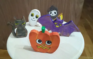 ハロウィンの飾り 昨日、糸ノコで切ったハロウィンの飾り。https://diy-square.cainz.com/chats/ieztpxfdcajppyfn 今日、色塗りしました。🎨🖌️ 偶然ですが、色塗っている時に気づきました。全部立つ!!🤭嬉しくなってしまいました。🤣棚に立てて飾れそうです。