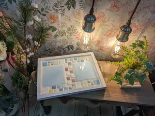 モザイクタイルのカフェトレイ 今年初のWS参加で作ってきました‼️ 枠の色は白と決めていたのですが、タイルはなかなか悩みました💦 インスピレーションを優先しつつ、一緒に参加した方やスタッフの方にもアイデアをいただきながら、満足のいく作品ができあがりました😆 そしてステキなフォトスポット✨最高です!!