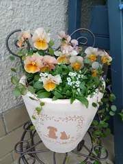 鉢の色とビオラの色がとても可愛いですねー❤️ シンプルだからか、鉢の🐶😺ちゃんも映えてお花も引き立ってますね💐
