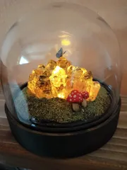 こちらでランプ類は一旦終了です😆 「炎の鉱石ランプ」の元の鉱石が自生(?)してるイメージ😄採掘される前…? 作ってすぐはレジンで作った鉱石とスノードームに穴を開け、鉱石と百均のろうそく風ライトをボンドで引っ付けただけだったんですが、なーんか面白くなく…。ジ◯リイメージで土やら苔や