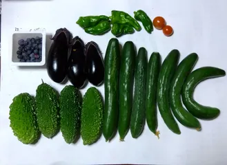 今日の収穫 昨日きゅうりがお休みでしたが今日は沢山収穫出来ました😊🎶ゴーヤも少し小さめを4本初収穫しました😉今日はゴーヤチャンプルにします💕きゅうり、ナス、ゴーヤ、ピーマンはお裾分けしました😉💕🎵