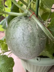 メロン栽培⑨ 少しずつメロンに網のような模様が出てきました。順調に育ってます。もう一つの鉢はなかなか実がつかなかったのですがやっとここまでになりました。 今日は雨なので玄関先にとりこんでいます。