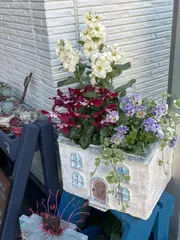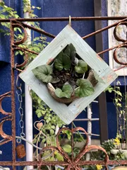 11/5のWSで作ったものをアレンジしました。造花の花つきでしたが植物を植えたくて、フレームもエイジング加工して作りました。ひし形状にかけてますがちょっと不安も😅とりあえずこれで育てて見ます。植物はビオラのラブラドリカです。春に紫のかわいい花が咲きます。