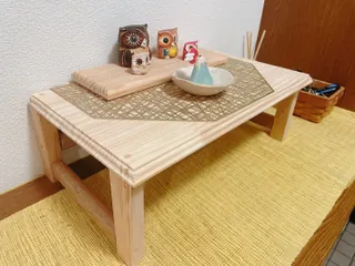 玄関ホールの棚の制作 もうすぐお正月🎍🎍🎍ですね。そこで玄関の鏡餅置きの棚を作ってよぉーとの依頼がありまして作ってみました。天板はパイン材を2枚合わせて奥行きを稼ぎました。天板はリビングで接着中なので写真は土台からです。土台の作成ちゃんとサイズを測ってと。。。余ってる材料で作ってるので右奥の脚が少しサイズが異なりますが奥
