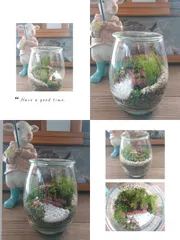 苔テラリウム(水辺でキャベツを洗う女性) 先日、仕事終わりにデパートのイベントのワークショップに参加して苔テラリウムを作りました♪水辺でキャベツを洗う女性をメインキャストにして、動物の苔テラリウムフィギュアをいくつか追加で配置しようかなーと思っています😊白い石を水色の砂に変えるかはちょっと思案中です🤔💭水色のほうが、より水辺らしくなるような