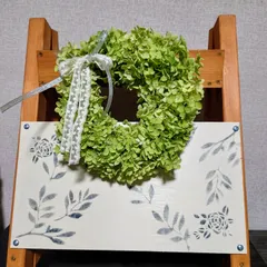 アナベル🤍が黄緑色💚になってきたのでリースにしました😊セリアの小さなリースにワイヤーでどんどん巻き付けでモリモリにしました 今回はナメクジさんは居なかったですカタツムリ🐌が葉っぱにいました😊 雨が降り続いてムシムシで過ごしにくい毎日😅好きなもので癒しの空間に♡