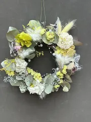 WSにて制作したサマーリース昨年のWSで制作したワイヤーアートに飾ってみました写真ではあまりよく撮れなかったのですがとても夏らしい涼しげな感じに仕上がりましたが、材料を全て使おうとしてかなり盛々になってしまいました