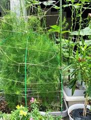 オクラの脇芽。ワサワサのアスパラガス。 オクラの脇芽伸ばしを実践中です。摘芯とかも良くわからないまま、1本だけ✂️しました。長く収穫出来ると嬉しいです。アスパラガスが倒れないように支柱補強したり、麻紐を掛けています。初めての植物は難しいけど楽しいです。これから気をつける事、アドバイスをいただけると嬉しいです。宜しくお願いします。
