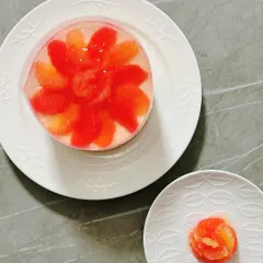 グレープフルーツのレアチーズケーキ🍊 cooking Funで作ってきたよー🙂ふわふわのヨーグルトクリームチーズで甘さ控えめなさっぱりケーキでしたー💕 真ん中にお花🌸みたいに作ったんだけど、ゼラチン入れたらよくわからなくなったので、別に作って隣に置いてみたよ😂 フィルム剥がすのもカットもキレイにできたよー!(真ん中は