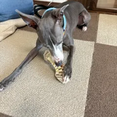 新しいおもちゃ🐶 おやつが上手く出せない😂網目におやつがはさまっているのですが、上手く出せず困り顔!ロープを投げたりして考えてます🐶 本当は🥕が欲しかったけど、フェルトの葉っぱが瞬殺でちぎられるので違うのにしました。葉っぱもロープなら良かったなぁ